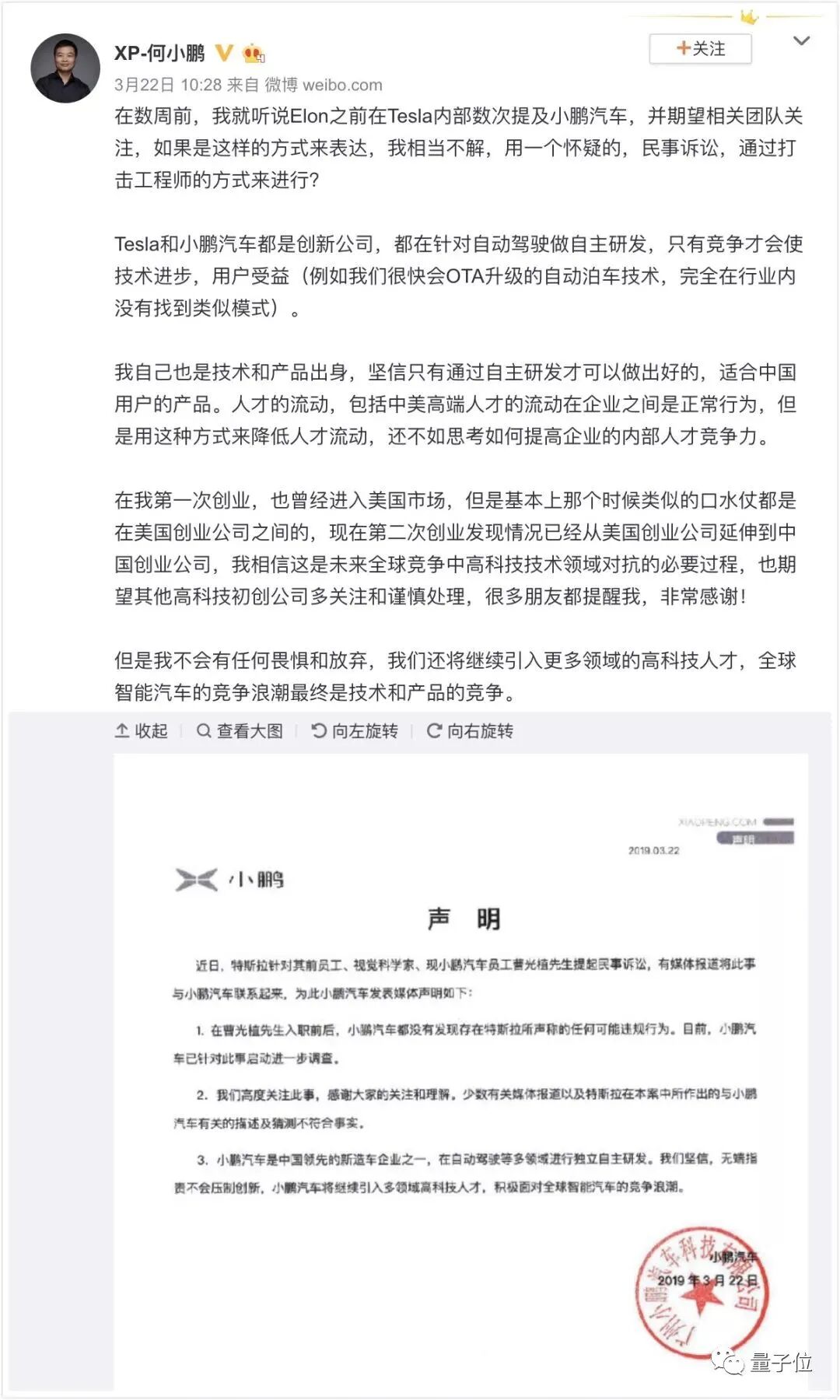 于是特斯拉与前员工曹光植和解,曹光植再次向无端被卷入的小鹏汽车致歉——同样以前员工的身份。