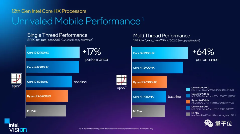 其中i9-12900HX最多拥有16个核心和5GHz频率,多核性能对比上代提升64%,相比苹果M1 Max提升则更多。