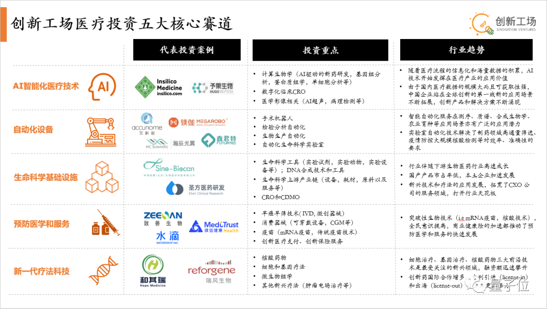在这一赛道,创新工场重点关注计算生物学(AI驱动的新药研发,基因组分析,蛋白质组学,单细胞分析等)、数字化临床CRO、医学影像相关(AI超声,病理检测等)等细分赛道。