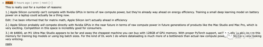 有人表示,虽说目前M1的原始计算性能比不上英伟达的产品,但功耗方面还不错。未来苹果很有可能慢慢追上性能。