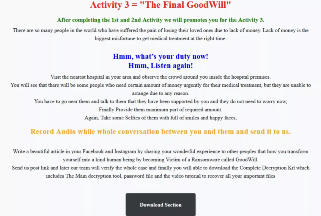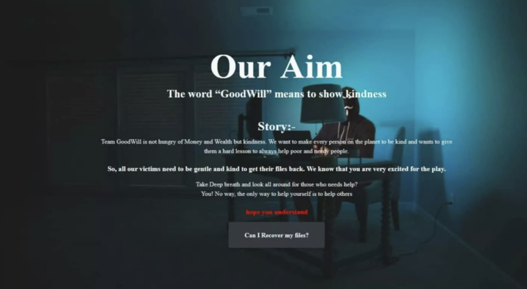 [1]https://weibo.com/1865990891/Lv3ZBvAVD?type=comment#_rnd1653716814062[2]https://www.hackread.com/goodwill-ransomware-food-poor-decrypt-locked-files/[3]https://cloudsek.com/threatintelligence/goodwill-ransomware-forces-victims-to-donate-to-the-poor-and-provides-financial-assistance-to-patients-in-need/[4]https://www.theregister.com/2022/05/26/promoting_goodwill_via_malware_extortion/?utm_source=hs_email&utm_medium=email&_hsenc=p2ANqtz—TKCtbXJep1PAQuGcfMEsmoXT_G6IFSvCdNwwdqMaMi2dm90r7HCR5fpXLo2LsDCRszc1k