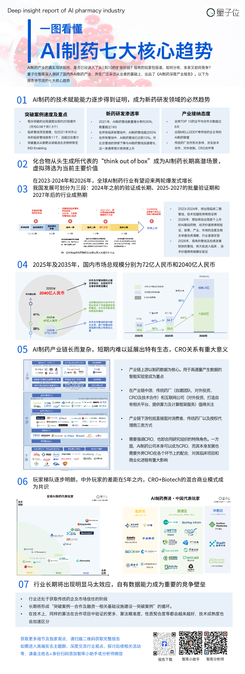 据量子位智库数据预估,AI制药市场规模在2025年预计将达到72亿,2035年则预计达到2040亿。