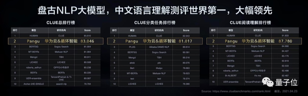 具体而言,盘古NLP大模型在权威的中文语言理解评测基准CLUE榜单中,总成绩及分类、阅读理解单项均排名第一,刷新三项榜单世界历史纪录,总成绩得分83.046。