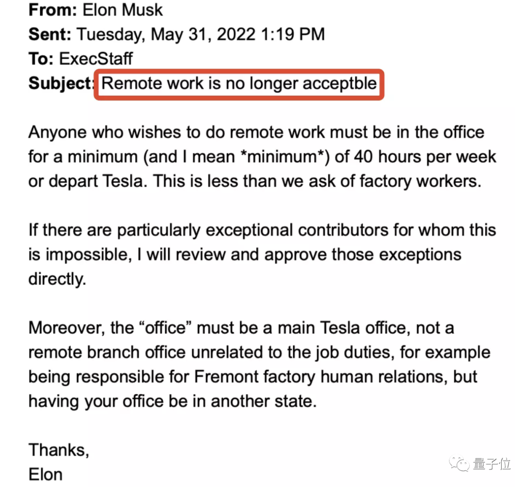[1]https://twitter.com/SamNissim/status/1531810291222192130[2]https://twitter.com/techemails/status/1531994582669348864?t=M2QUC4cqnQUMzRsgDy4FIw[3]https://arstechnica.com/tech-policy/2022/06/musk-to-tesla-and-spacex-workers-be-in-the-office-40-hours-a-week-or-quit/[4]https://finance.sina.com.cn/tech/2022-06-02/doc-imizirau6124176.shtml[5]https://www.businessinsider.com/elon-musk-americans-avoid-going-to-work-unlike-chinese-workers-2022-5