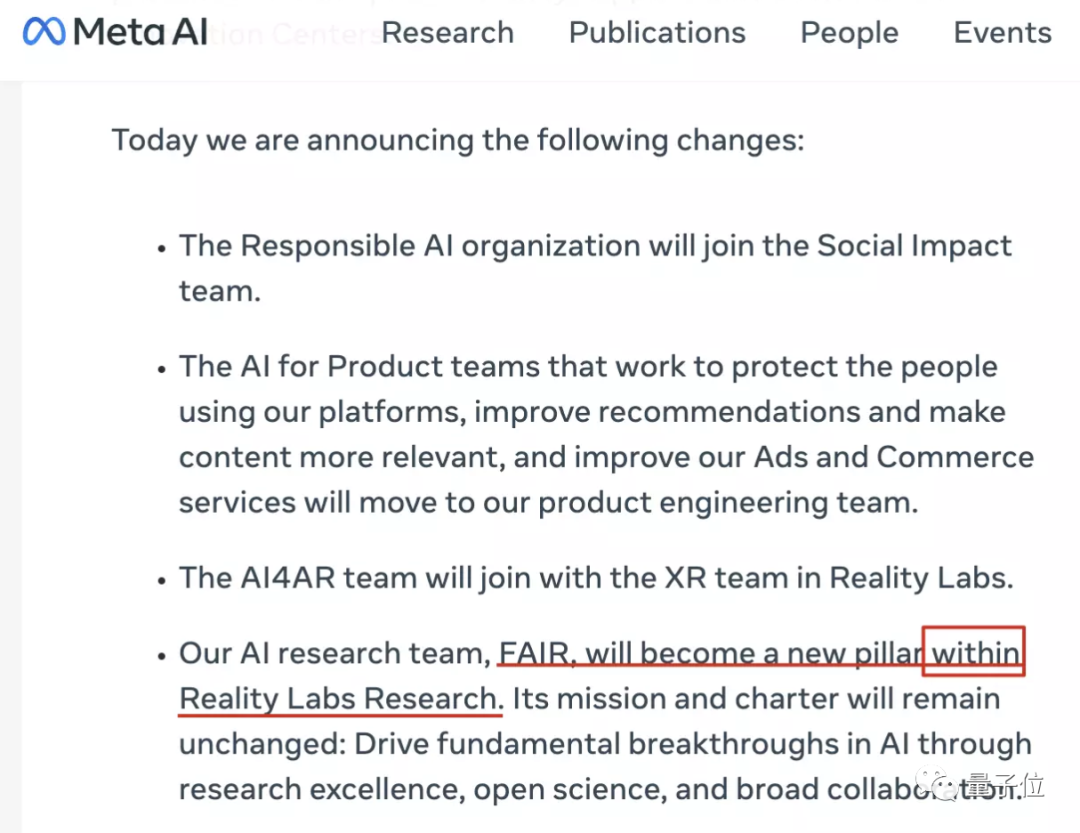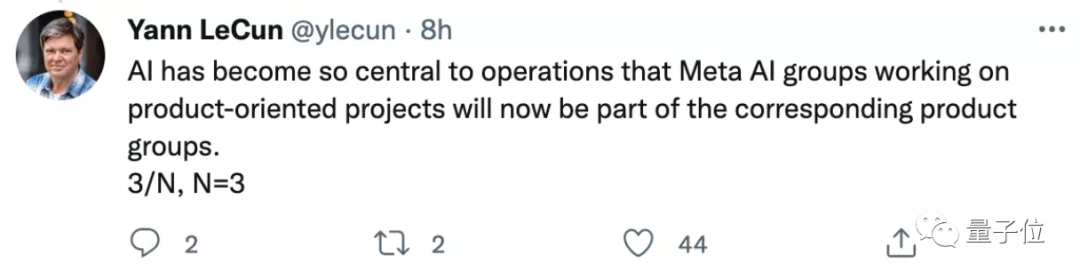 参考链接:[1]https://ai.facebook.com/blog/building-with-ai-across-all-of-meta/[2]https://twitter.com/schrep/status/1532394011033407488[3]https://twitter.com/ylecun/status/1532423448282157061[4]https://www.theverge.com/2022/6/2/23151819/meta-head-of-ai-jerome-pesenti-to-depart-in-reorg[5]https://www.axios.com/2022/06/02/meta-facebook-ai-decentralize[6]https://www.theverge.com/2022/5/18/23125571/meta-hiring-freeze-commerce-messenger-kids-facebook-gaming[7]https://www.reuters.com/technology/exclusive-facebook-owner-meta-tells-hardware-staffers-prepare-cutbacks-2022-05-11/