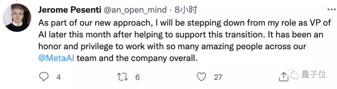 现在AI副总裁Jerome Pesenti,也宣布将在6月晚些时候离开。