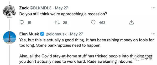 5月底,马斯克就曾在推特上表示,美国经济衰退将会持续12-18个月。