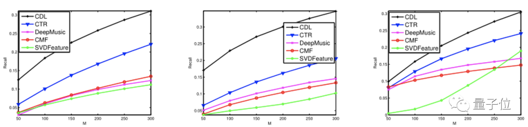 △CDL、CTR、DeepMusic、CMF和SVDFeature在同一数据集上的性能比较,CDL大幅优于其他方法