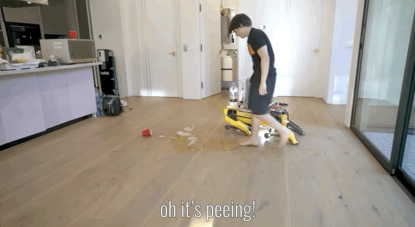 在这段视频里,Michael展示了他半年来的“调教”成果:机器狗终于能把啤酒“尿”到杯子里,且一滴不撒。