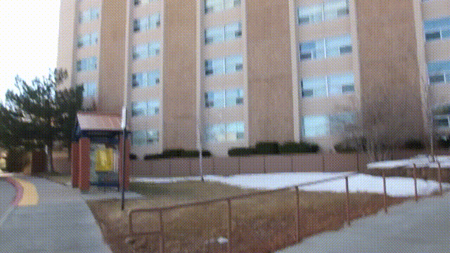 Michael先带着这撒尿机器狗回到了母校北亚利桑那大学,并在校门前“撒尿留念”: