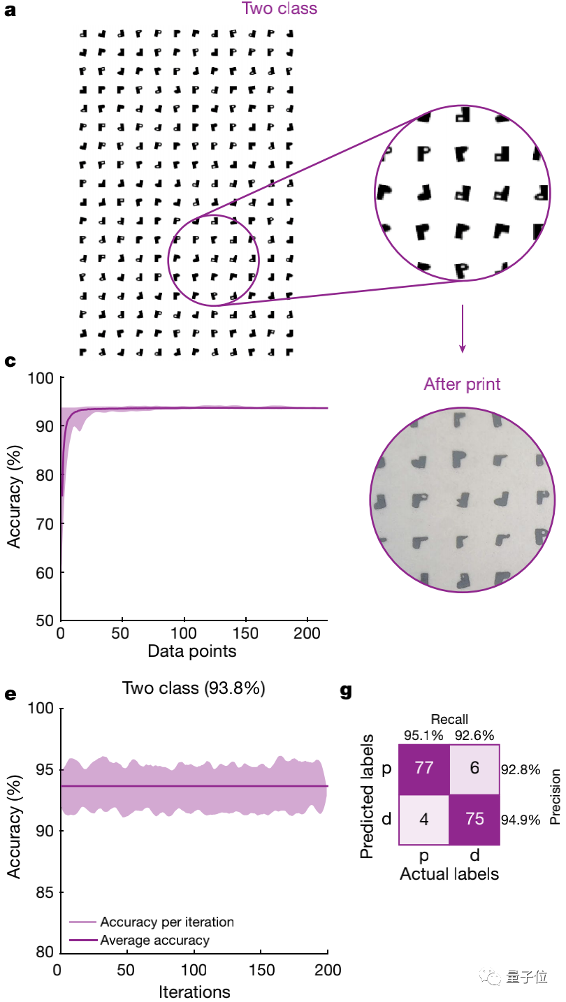 一组实验测试了PDNN芯片的二分类性能:需要对共计216个“p”和“d”字母组成的数据集进行分类。