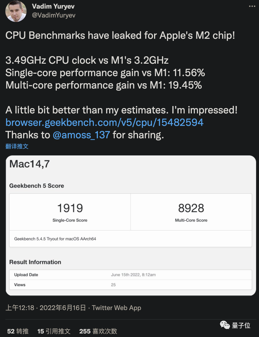 苹果M2芯片Geekbench性能跑分曝光:比M1快20%