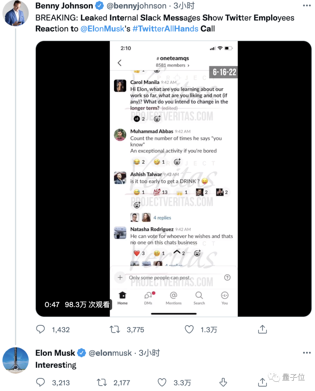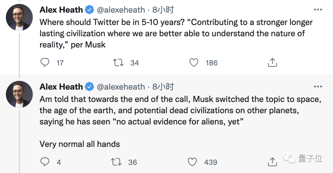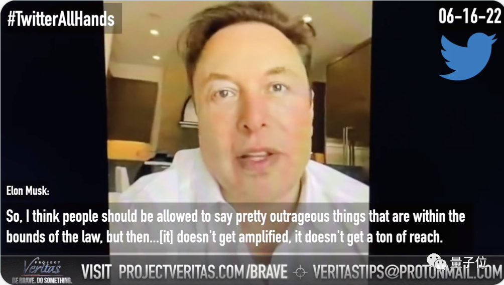 参考链接:[1]https://twitter.com/alexeheath/status/1537472425226432513[2]https://www.bloomberg.com/news/articles/2022-06-16/musk-tells-staff-twitter-should-allow-pretty-outrageous-tweets[3]https://www.theverge.com/2022/6/16/23171054/elon-musk-twitter-deal-1-billion-users-wechat-tiktok[4]https://www.theverge.com/2022/6/16/23170228/spacex-elon-musk-internal-open-letter-behavior
