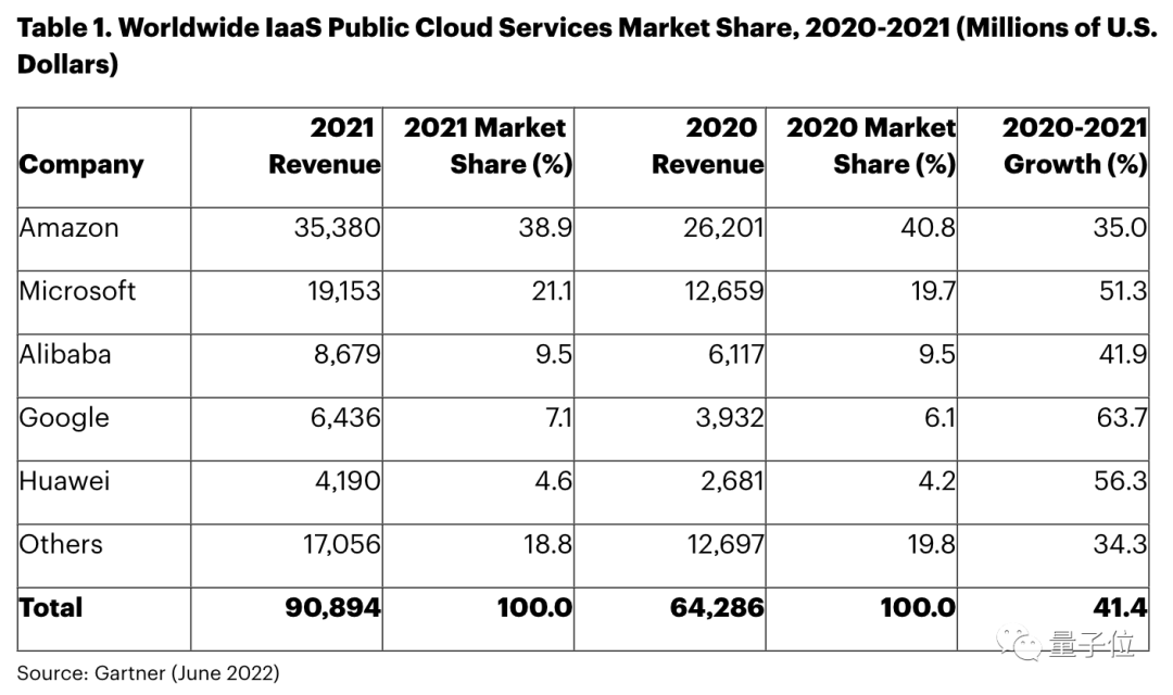 △Gartner 2020-2021年IaaS公有云市场占有率数据
