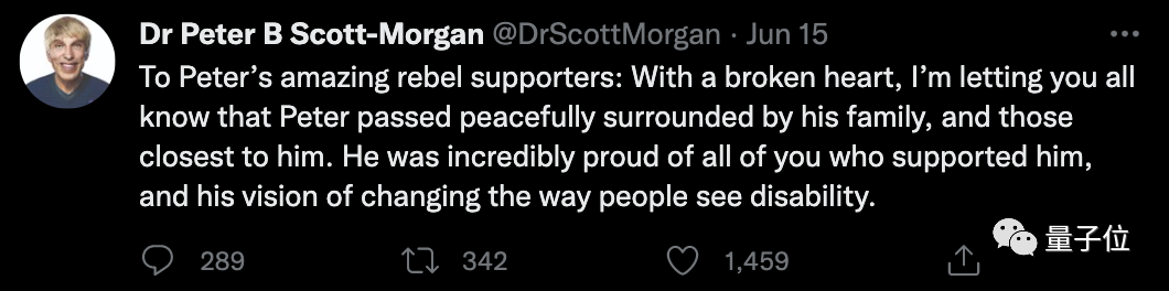 致彼得的支持者们:悲伤地告诉大家,彼得在他的家人和他最亲近的人的陪伴下平静地去世了。他为所有支持他的人感到无比自豪,也为他改变人们对残疾的看法之愿景感到无比自豪。