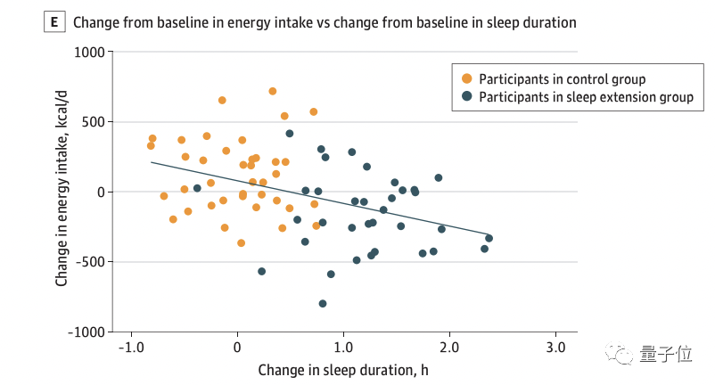 研究团队对实验样本的能量消耗和能量储存进行计算,得出能量摄入量,而经过睡眠干预的延长组样本,依据霍尔动态预测模型,平均睡眠时长增加1.2小时,可以减少的能量摄入量为270千卡。