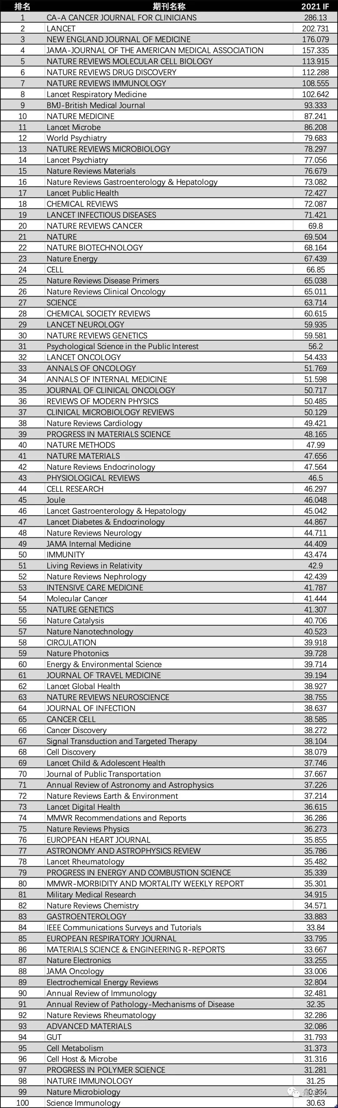 以下是根据科睿唯安此次公布的数据,所列举的Top 100的期刊:
