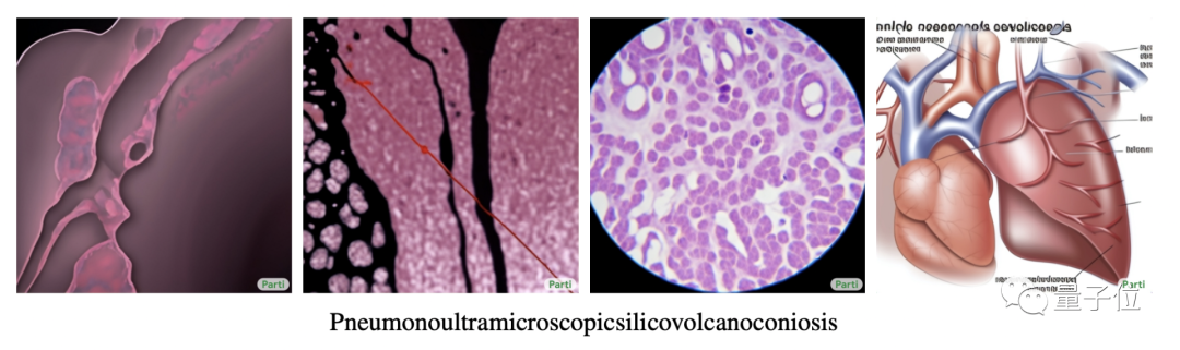 在把这个单词“投喂”给Parti后,它就能有模有样地生成多张合情合理的肺部疾病图片: