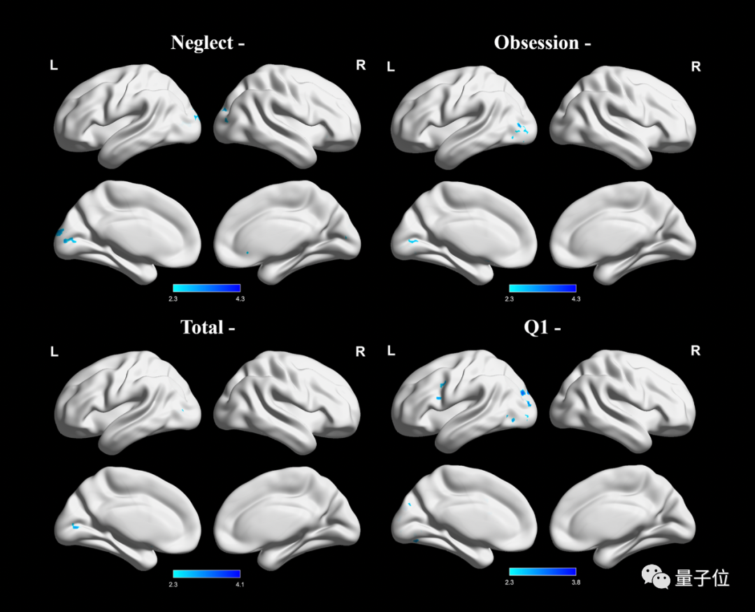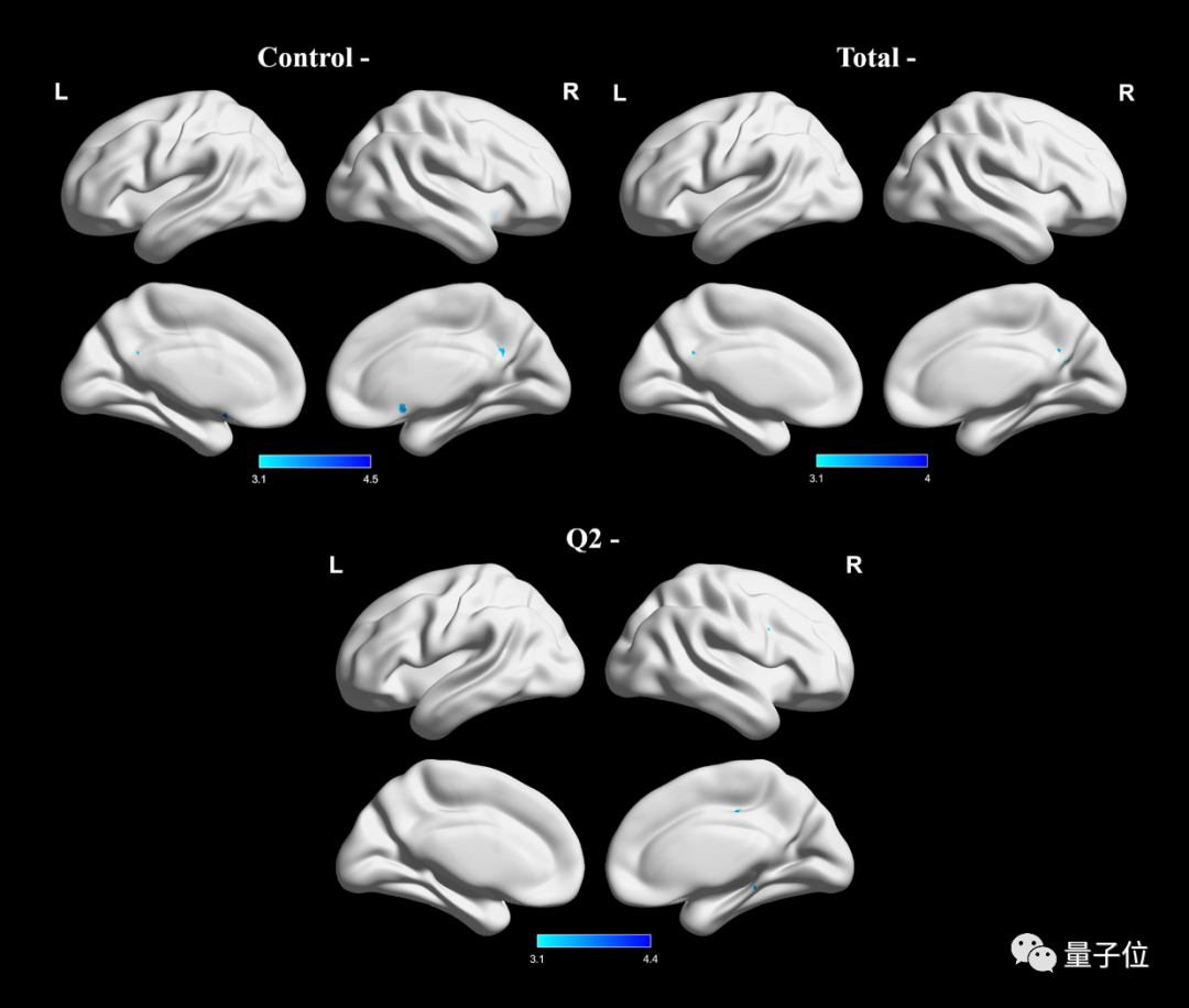 问卷总分,与双侧楔前回和双侧PCC的失活呈负相关,主观问题2得分与右丘脑、右海马旁回和右双侧扣带回的失活呈负相关。