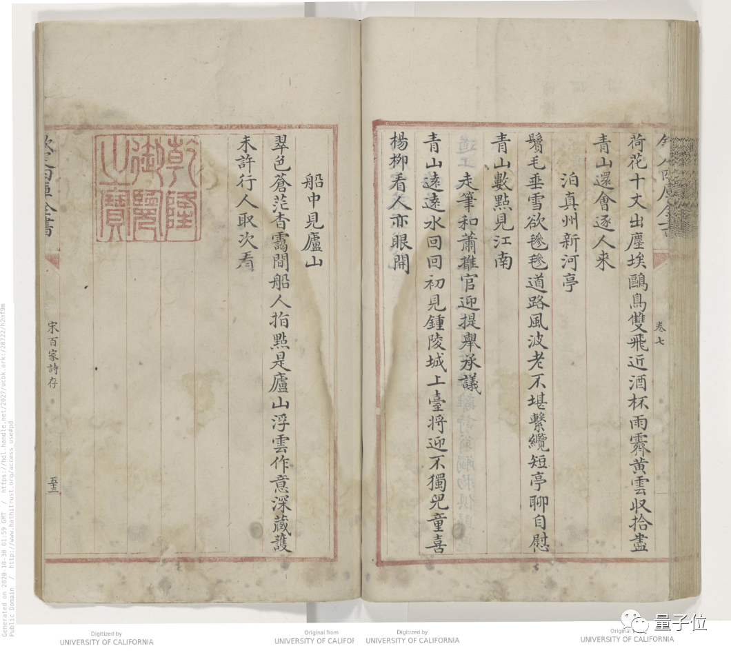 直到将近100年后的1950年代,清代曹庭栋辑纂的《宋百家诗存》 (卷七),出现在美国加州大学伯克利分校东亚图书馆。