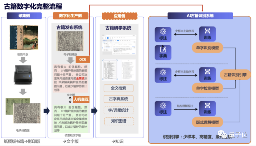 在机器为主进行识别的97.5%的内容中,约有1%(1万字左右)需要专家录入;机器不能识别的余下2.5%(2.5万字)的文字,全部交给专家做后期标注。