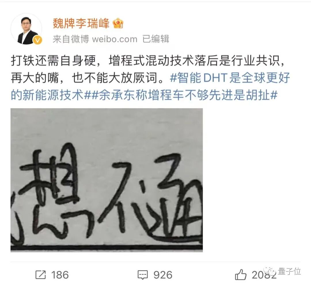 对此,魏牌CEO李瑞峰发微博回怼:增程式混动技术落后是行业共识。