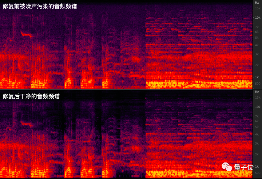 这一点在频谱图上也表现得很明显:降噪前,音频频谱较为浑浊;降噪后,频谱图清晰了不少。