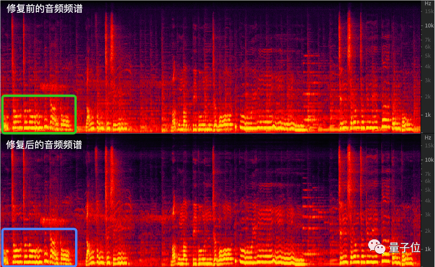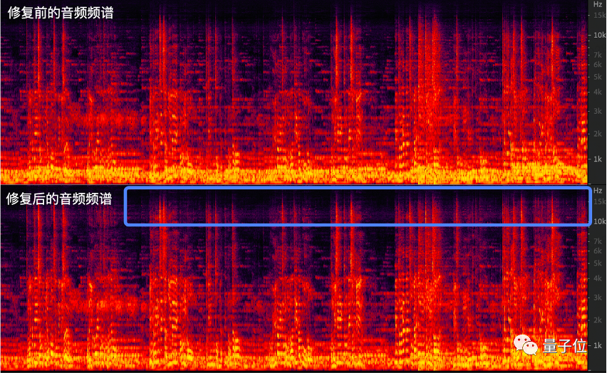 从蓝框部分可以看到,经过超分,原始音频的高频部分得到了拓展和增强。
