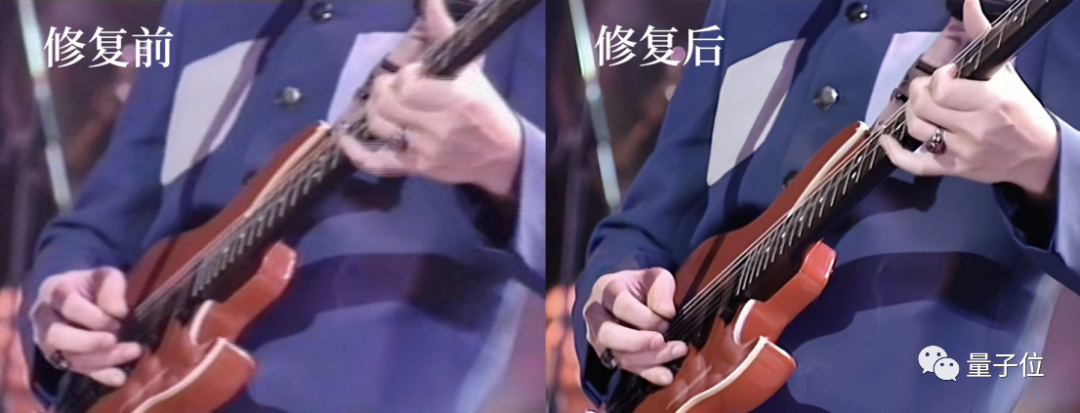 从结果来看,修复后吉他手的手部伪影完全被去除了,轮廓也清晰了起来。