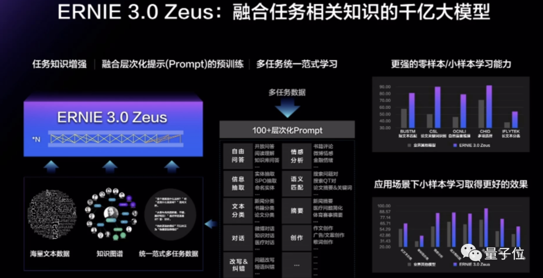 它是一个任务知识增强的大模型,除了可以对无标注数据和知识图谱的学习之外,还可以通过持续学习,对百余种不同形式的任务数据学习。