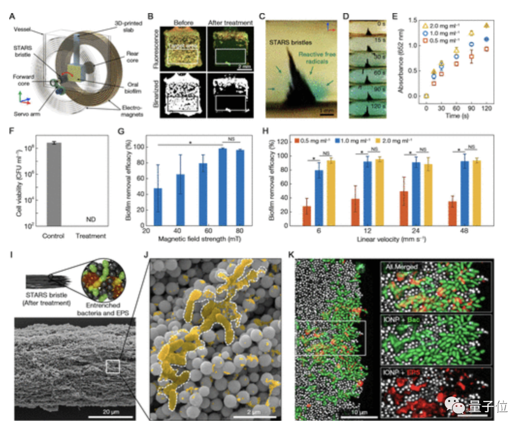 通过这个控制平台,IONP就可以变成具备一定刚性,类似于鬃毛一样的形态,这些鬃毛可以像牙刷一样,刺穿牙齿表面的生物膜,直达牙垢覆盖面进行清理。