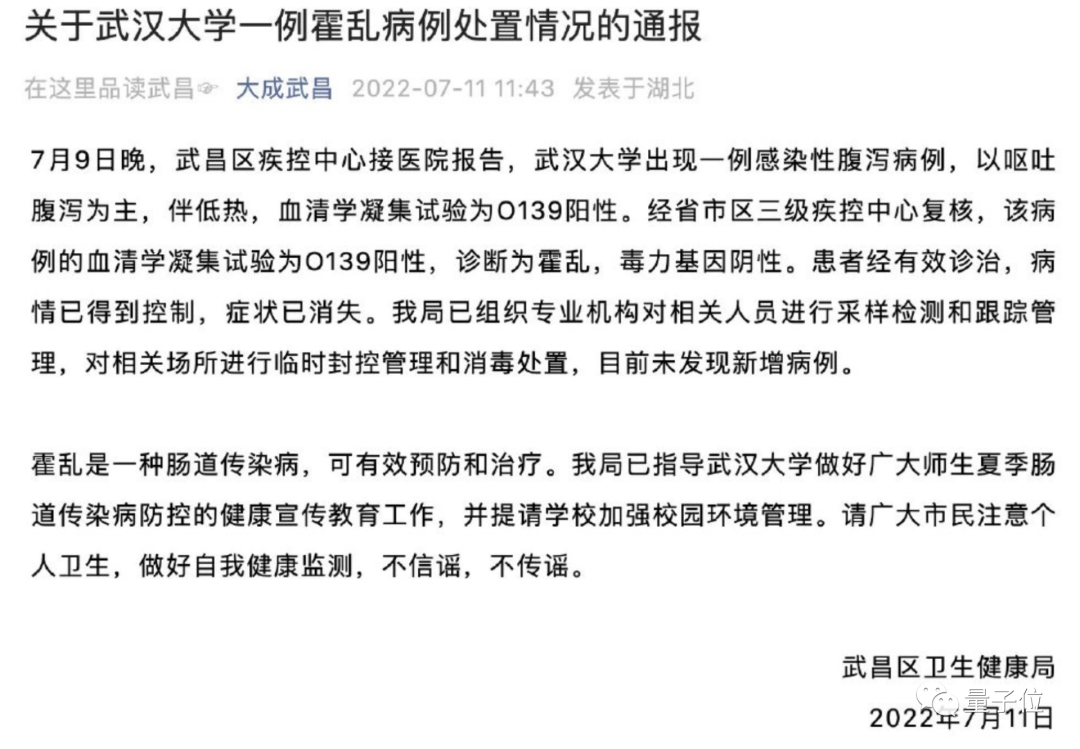 同时昨天武汉大学官方也发布通知,提示校内相关人员加强夏季肠道传染病预防。