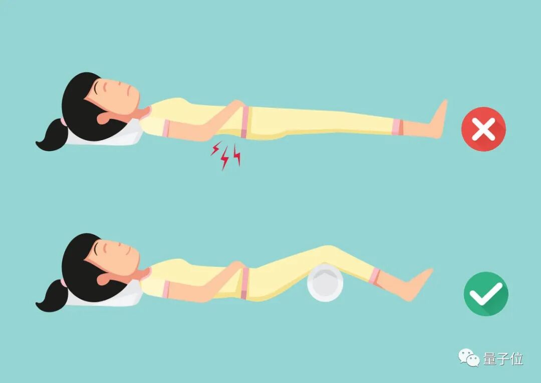这时,在膝盖下方放一个枕头可以帮助调整脊椎曲线——腿垫起来后,腰就自然和床贴合了,脊柱也进入了松弛状态。