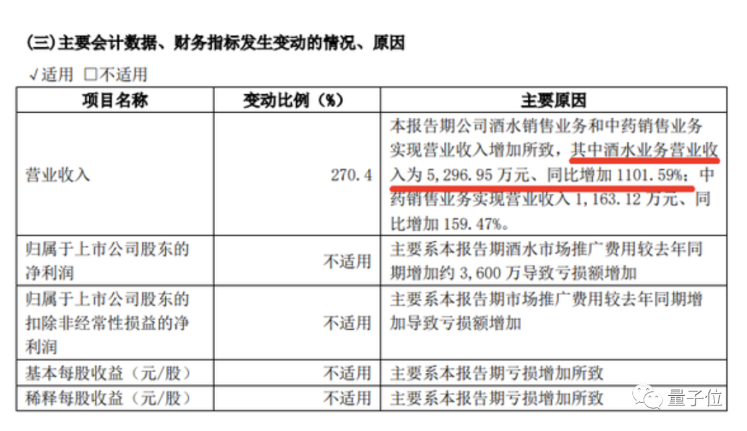 公司整体仍处于亏损状态,但在一季度7500多万元的总营收中,酒水业务就贡献了5296.95万,同比增长1101.59%;拉动公司酒水业务板块在一个季度的营收,就相当于去年全年的营收的2倍。