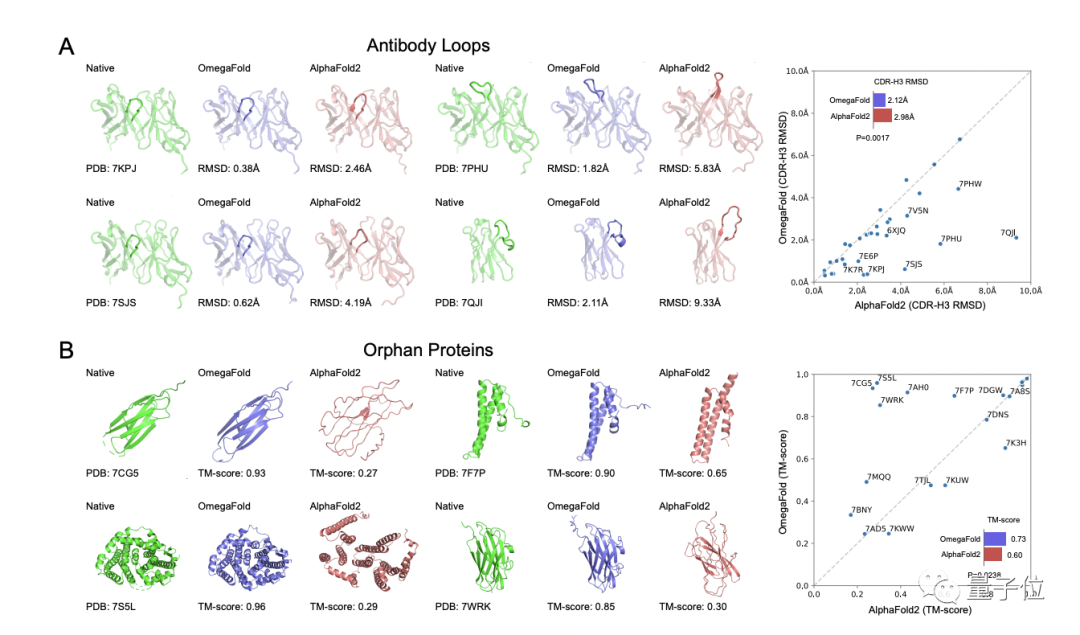 基于此,研究团队用OmegaFold,对两类缺乏蛋白质同源进化信息的蛋白质,抗体蛋白质和孤儿蛋白质进行结构预测。