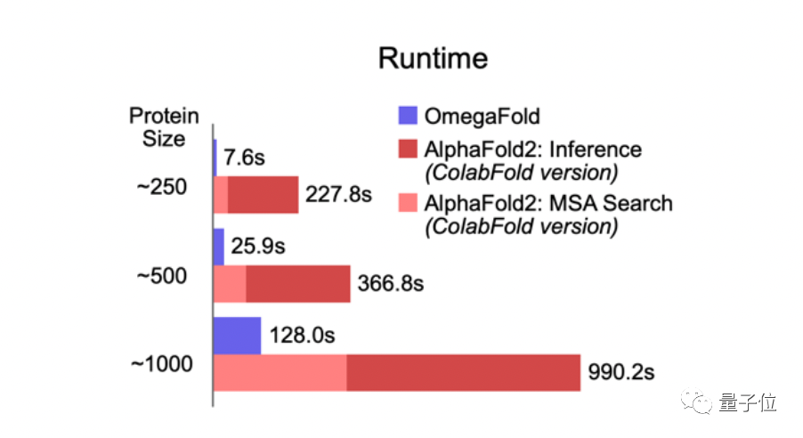 而且,研究团队还发现,因为只采用单一序列预测蛋白质的3D结构,因此在AI算法的训练和预测速度上,也有很大提升,蛋白质结构预测时间,可以被压缩到数秒内。