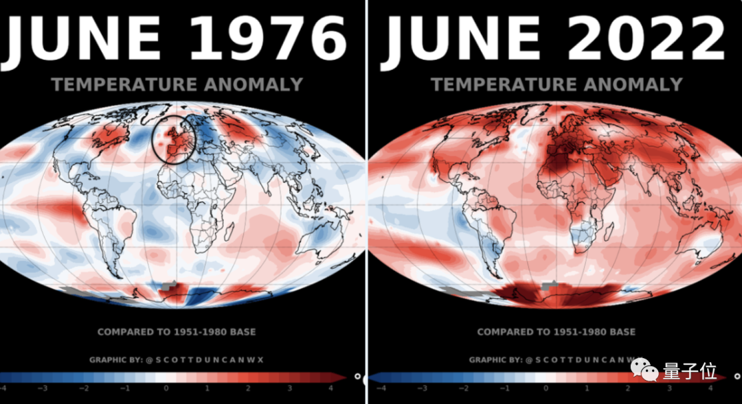 一位气象学家分享了一张1976年和今年6月份全球气温的对比图,不难发现如今全世界都快“热炸了”。