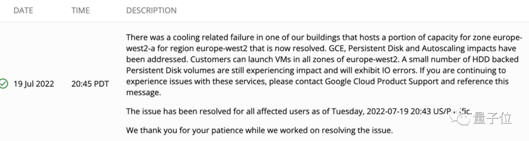 温度给设备带来的影响也是持续性的。虽然谷歌云的冷却系统已基本修好了,但服务器的I/O传输还有点问题。