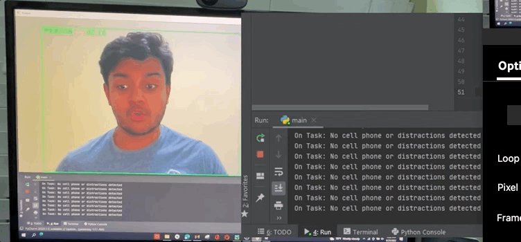 当他专注时(摄像头视野内没有出现手机等物体),计算机会实时显示“On Task”。