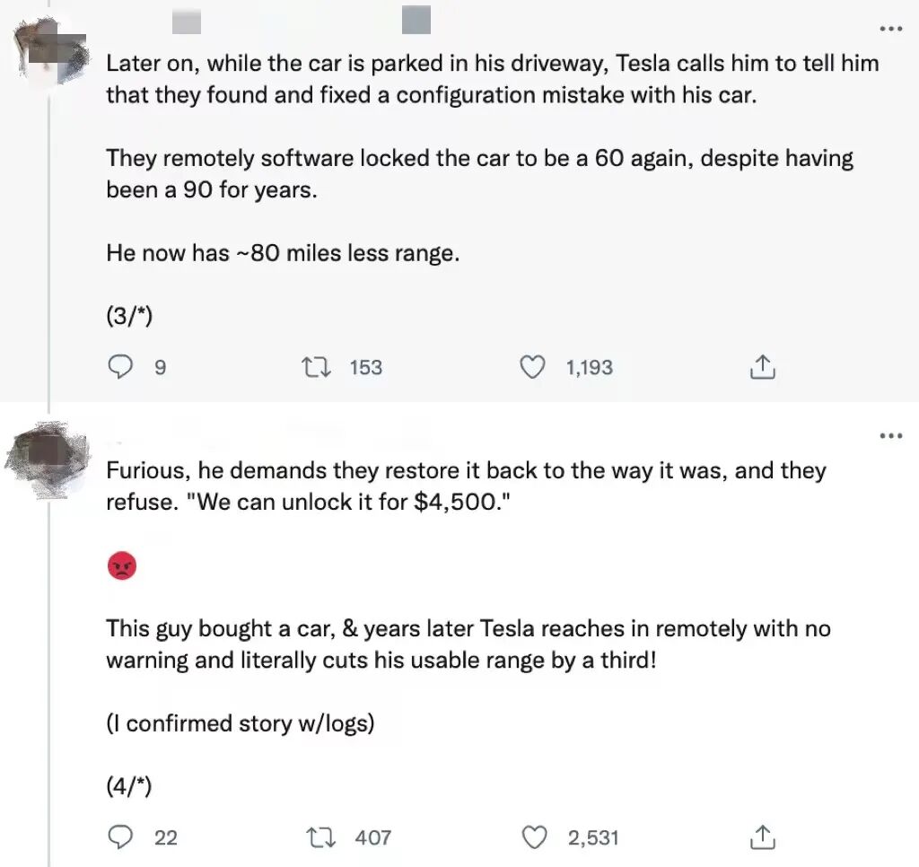 一位博主发推爆料特斯拉在没有预先发通知的情况下,通过远程操控将一辆车的电池容量从90kWh重新锁定为60kWh,导致该车的续航里程直接减少了1/3(约80英里)。