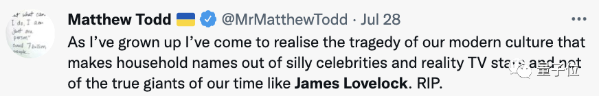 对于他的突然逝去,有网友遗憾地表示:随着我长大,我才意识到詹姆斯·洛夫洛克才是这个时代真正的巨人。