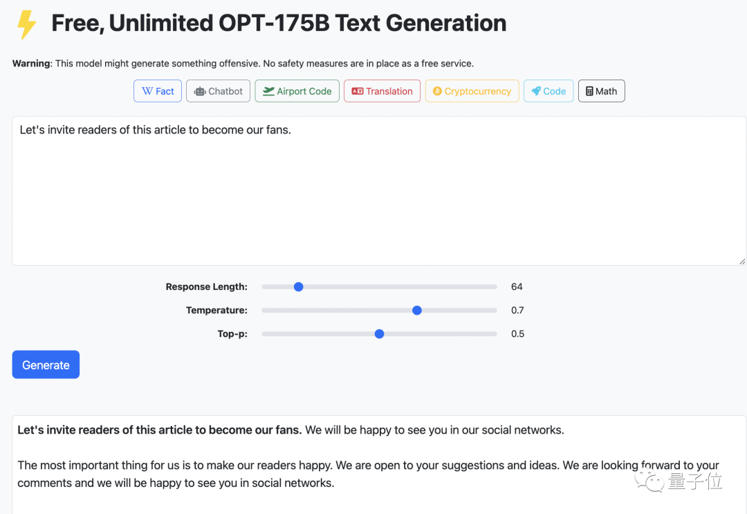 这个网站是依托Meta AI开源的预训练语言模型OPT-175B做的,背后团队来自加州大学伯克利分校。