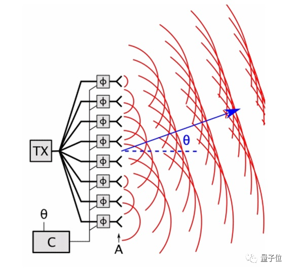如果发出的波不完全同步,两个波纹之间就会产生相移,这时通过计算机来控制每个单元发出的电磁波的相位差,就能让波向着想要去的方向传播了。
