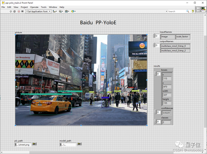 双方的联合也进一步给更多的企业提供了创新探索的机会。上海仪酷智能科技有限公司就结合双方技术优势,实现了在NI LabVIEW软件中调用 PP-YOLOE模型进行目标检测的功能,完成在图像识别领域的技术创新,拓展了应用空间。