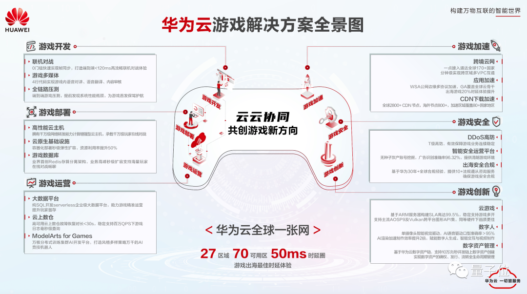 游戏出海方面,则聚焦海外新兴市场,华为云提供全球一张网、游戏加速、本地化服务以及云云协同,助力游戏企业开拓出海新航道。