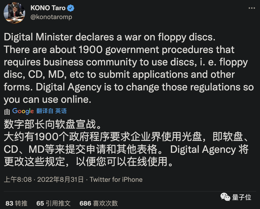 参考链接:[1]https://www.businessinsider.com/japan-government-tokyo-floppy-disks-still-trying-to-phase-out-2021-10[2]https://twitter.com/konotaromp/status/1564767072554745856[3]https://news.yahoo.co.jp/articles/4b1ea95e846011679bf6f849107cf039982f1823[4]https://cj.sina.com.cn/articles/view/1887344341/707e96d5020016v3h
