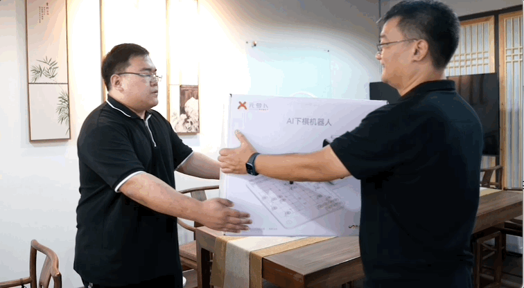 由于是线下首位购买者,商汤创新工程院院长沈徽担任“送货员”一角,把首台元萝卜交到这位象棋大师董子仲手里。