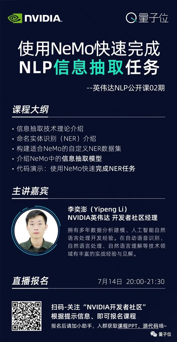 7.14晚8点,英伟达专家将通过理论讲解与代码演示,分享如何使用NeMo快速实现NLP中的信息抽取任务。快来扫码报名吧~