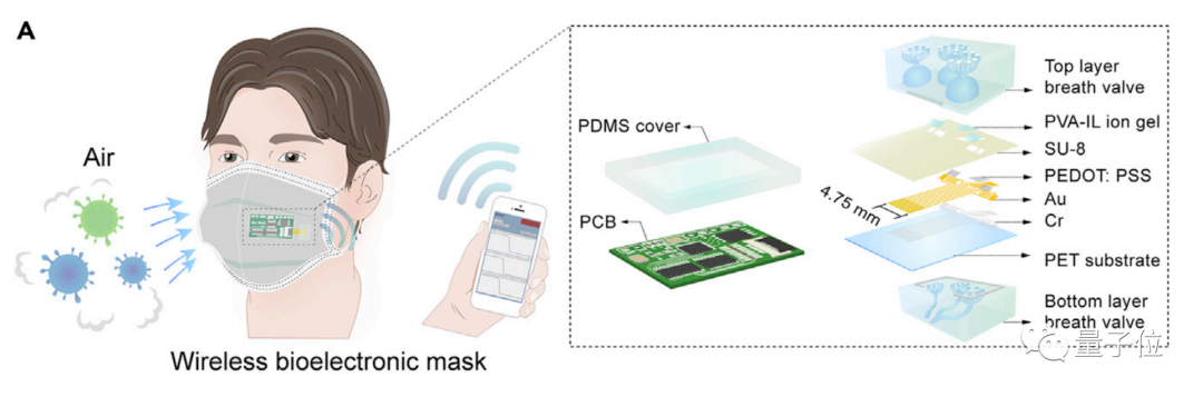 研究人员为了让这个装置能够和柔软弯曲的口罩更加贴合,打造它所采用的材料是又薄又灵活的聚对苯二甲酸乙二醇酯(PET)基板。