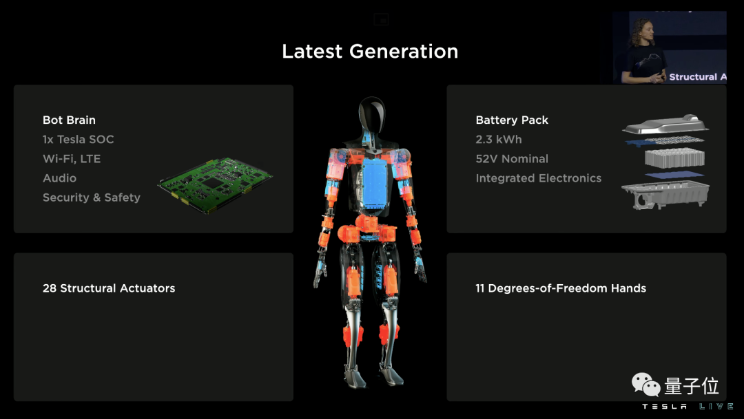 最新版本的特斯拉擎天柱,大脑用的是特斯拉SoC芯片,能源靠的是2.3千瓦时电池组,全身28个执行器(Actuator)。另外手部11个自由度,五指可以独立运动。
